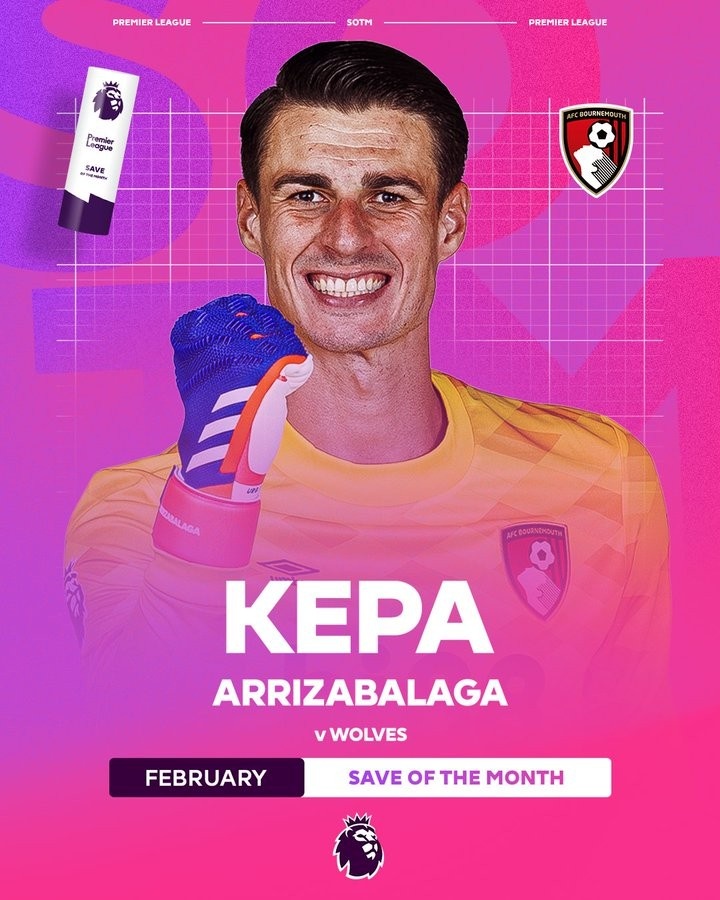 3月14日讯 英超官方宣布,切尔西外租到伯恩茅斯的门将凯帕,在对阵狼队时的两连扑当选为英超2月最佳扑救。