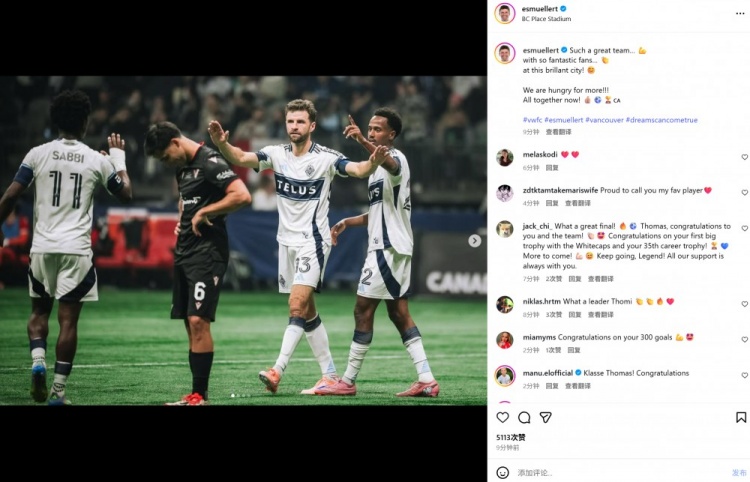 点射破门助温哥华白浪夺冠,穆勒社媒晒照纪念:我们还渴望更多!