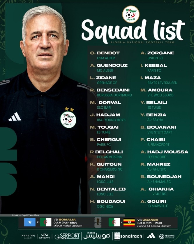 2025-10-03 00:00:19阿尔及利亚大名单:马赫雷斯、本塞拜尼领衔,齐达内之子卢卡入选