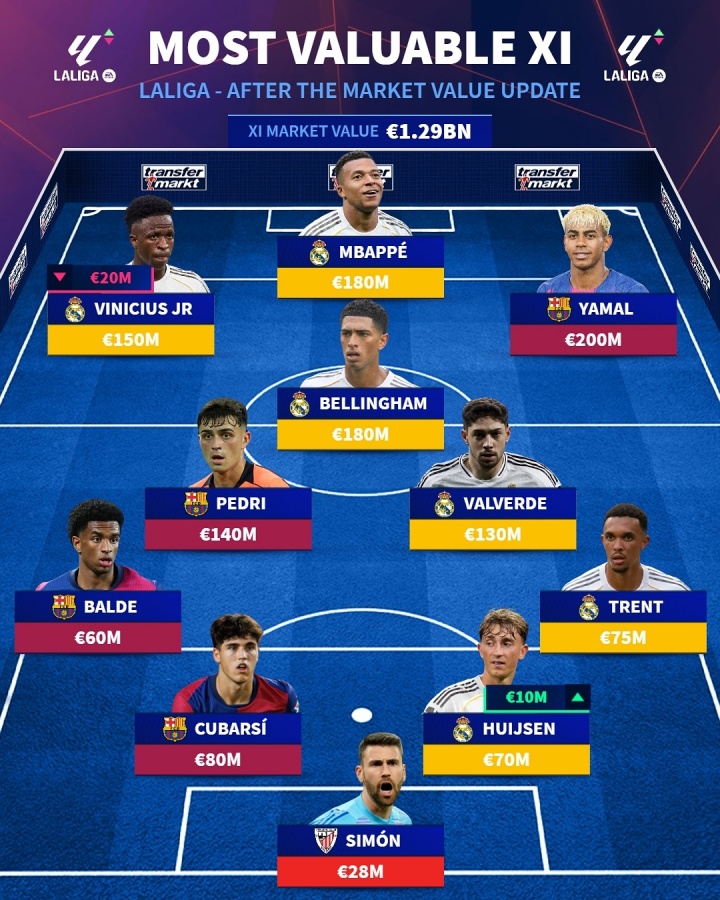 2025-10-03 00:01:22身价12.9亿欧!德转列西甲最贵阵:中前场6人全部上亿 无马竞球员