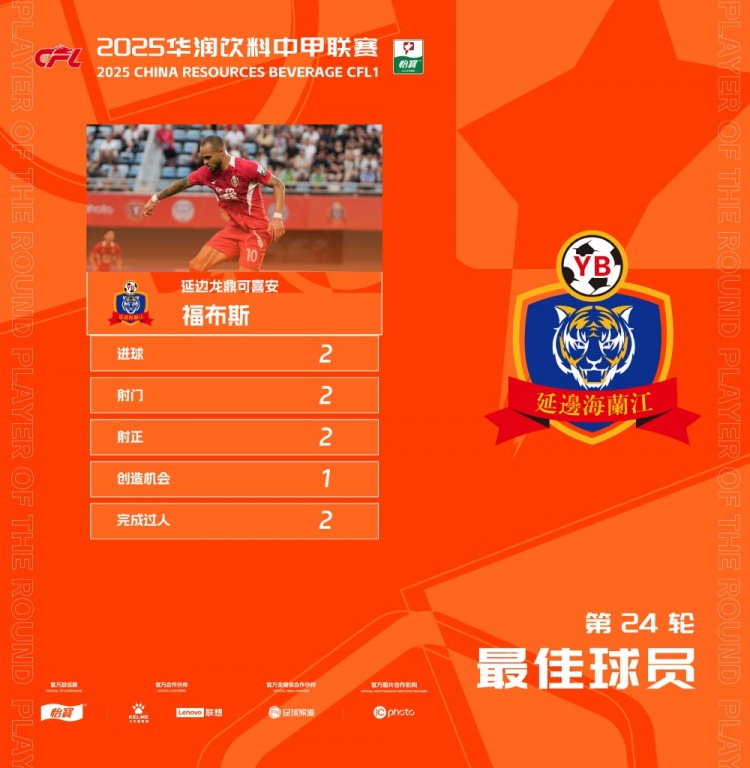 本轮延边龙鼎3-0战胜重庆铜梁龙,福布斯在比赛第58分钟打破僵局,随后又在第62分钟完成梅开二度。凭借他的优异表现,延边龙鼎最终轻松取胜。
