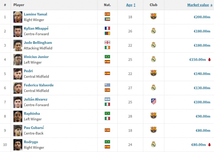 西甲最新身价前十:亚姆贝前三维尼修斯仍第四,佩德里1.4亿第五