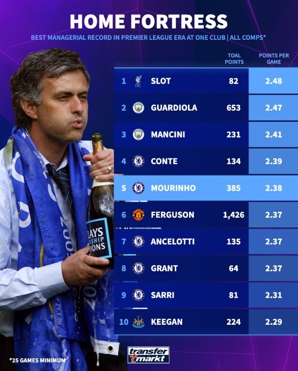 10月3日讯 根据德转统计,在英超执教单一俱乐部各项赛事主场场均得分榜上,斯洛特位列第一,瓜迪奥拉第二,穆里尼奥第五,弗格森第六。